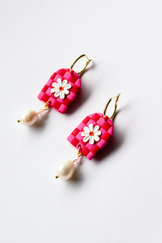 Checkerboard Daisy Hoop with Pearl // Pink & Red