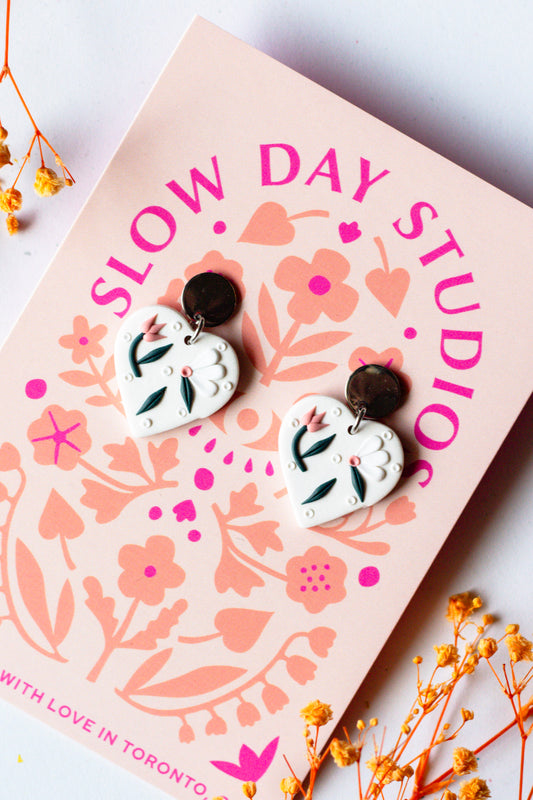 Floral Heart Clay Dangle Earrings // Speckled Sage