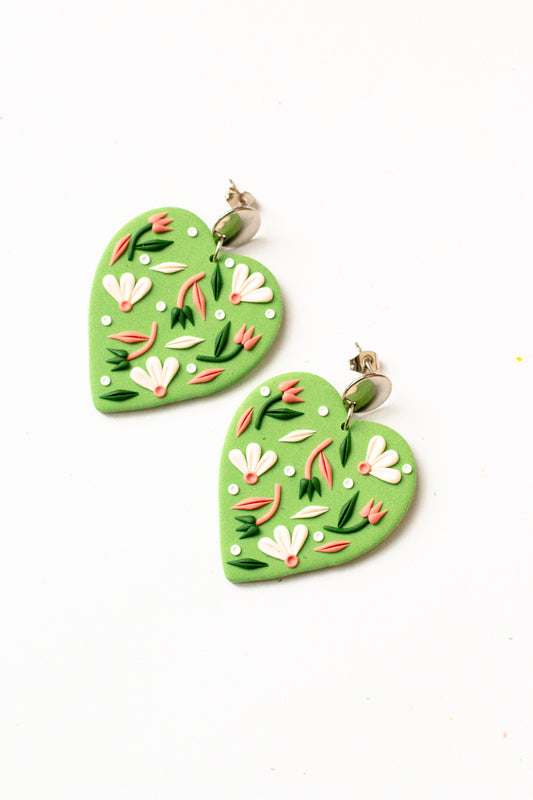 Floral Heart Clay Dangle Earrings // Speckled Sage