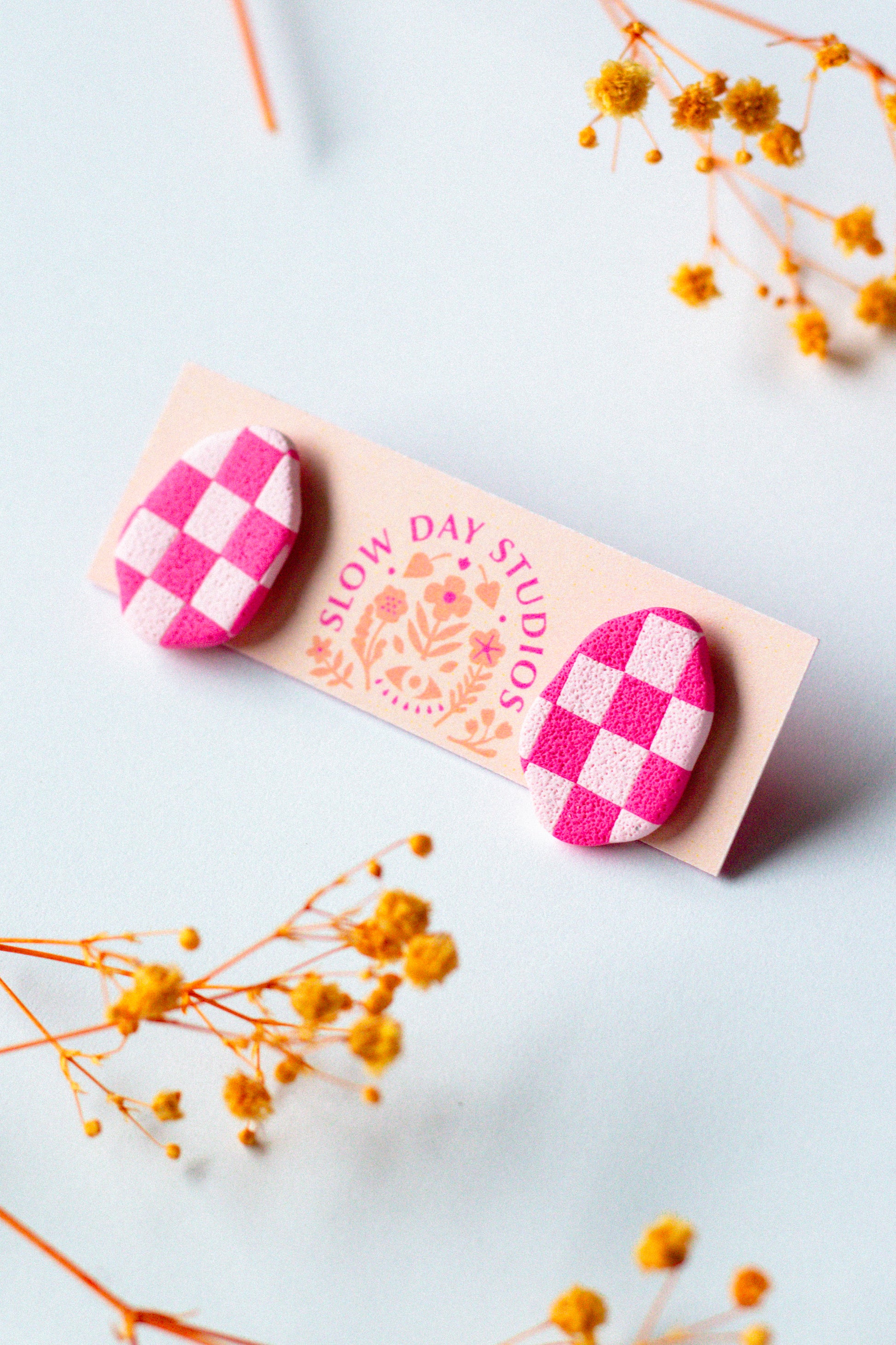 Checkerboard Organic Oval Stud // Pink Monochrome
