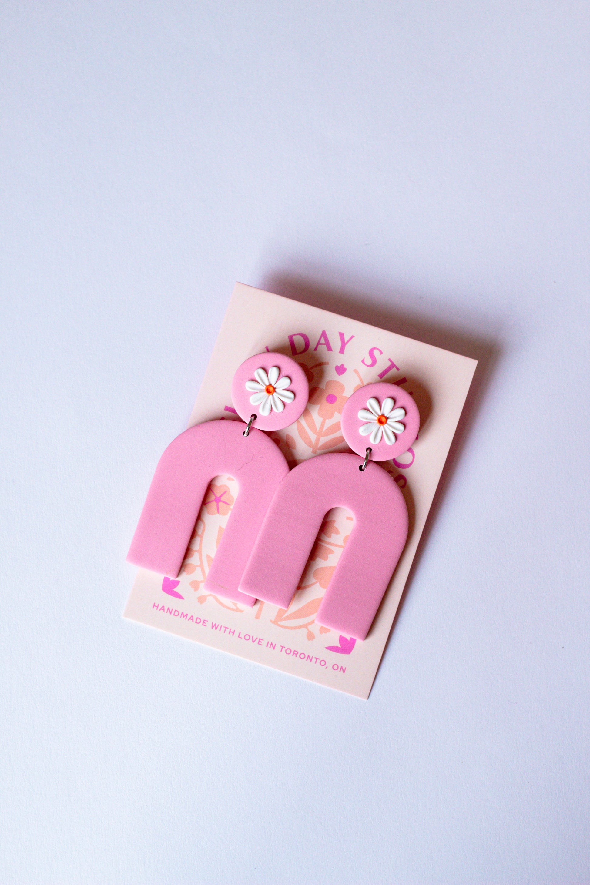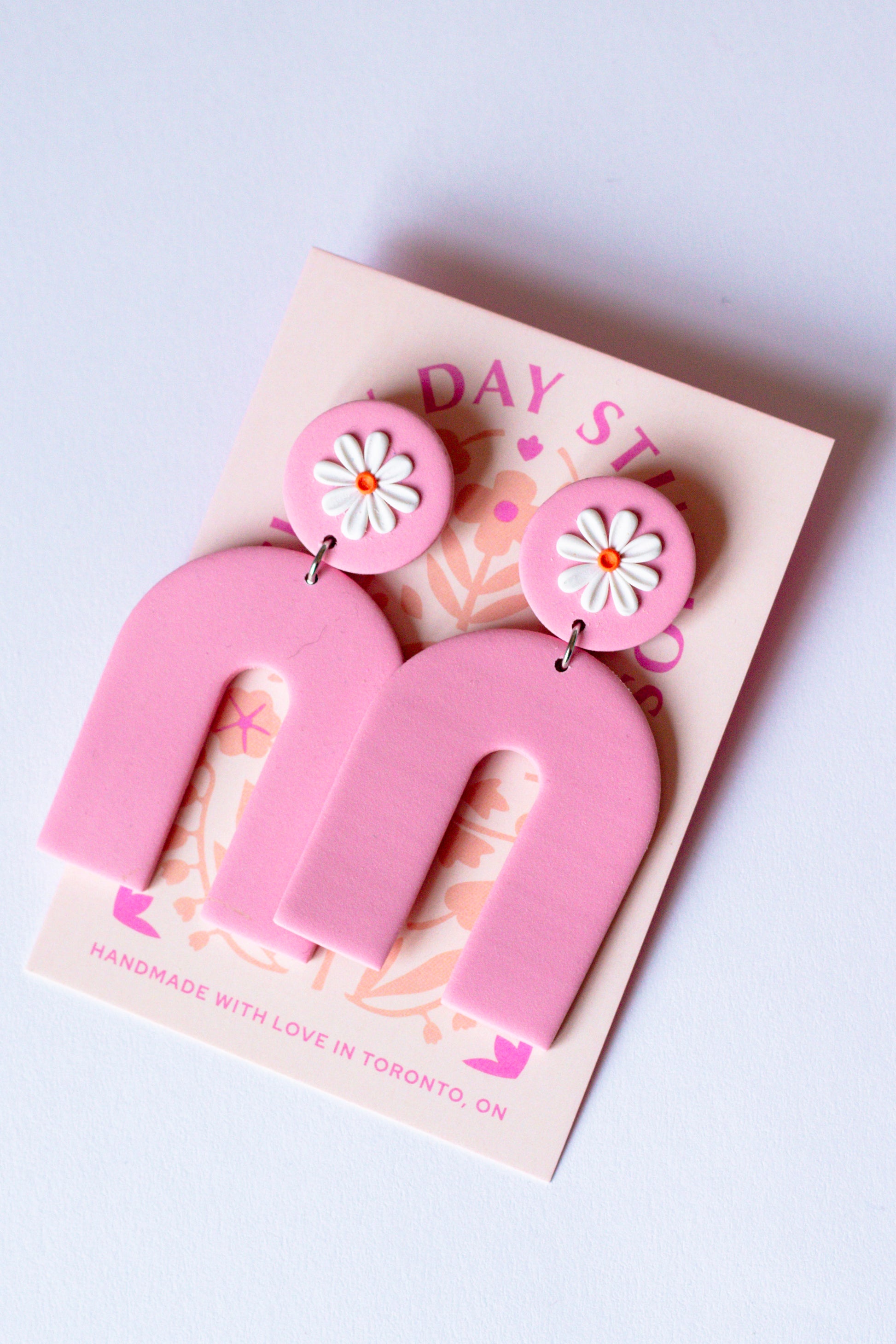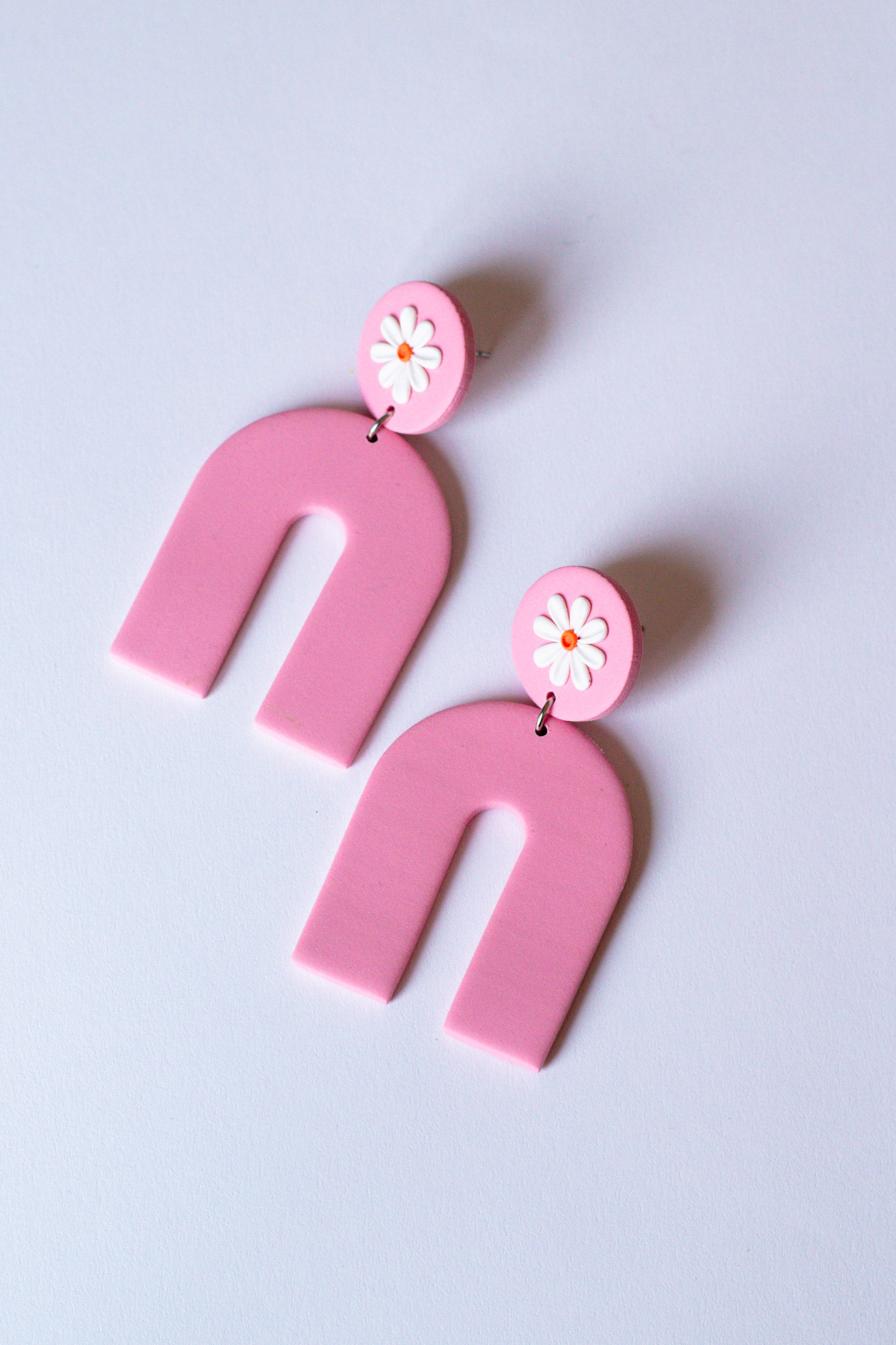 Add a playful pop to your look with these handmade polymer clay earrings! Featuring a light pink arch design and white daisy, these statement earrings are lightweight, bold, and perfect for spring and summer outfits. Hypoallergenic and made with love in Toronto, these trendy earrings are ideal for boho fashion lovers.