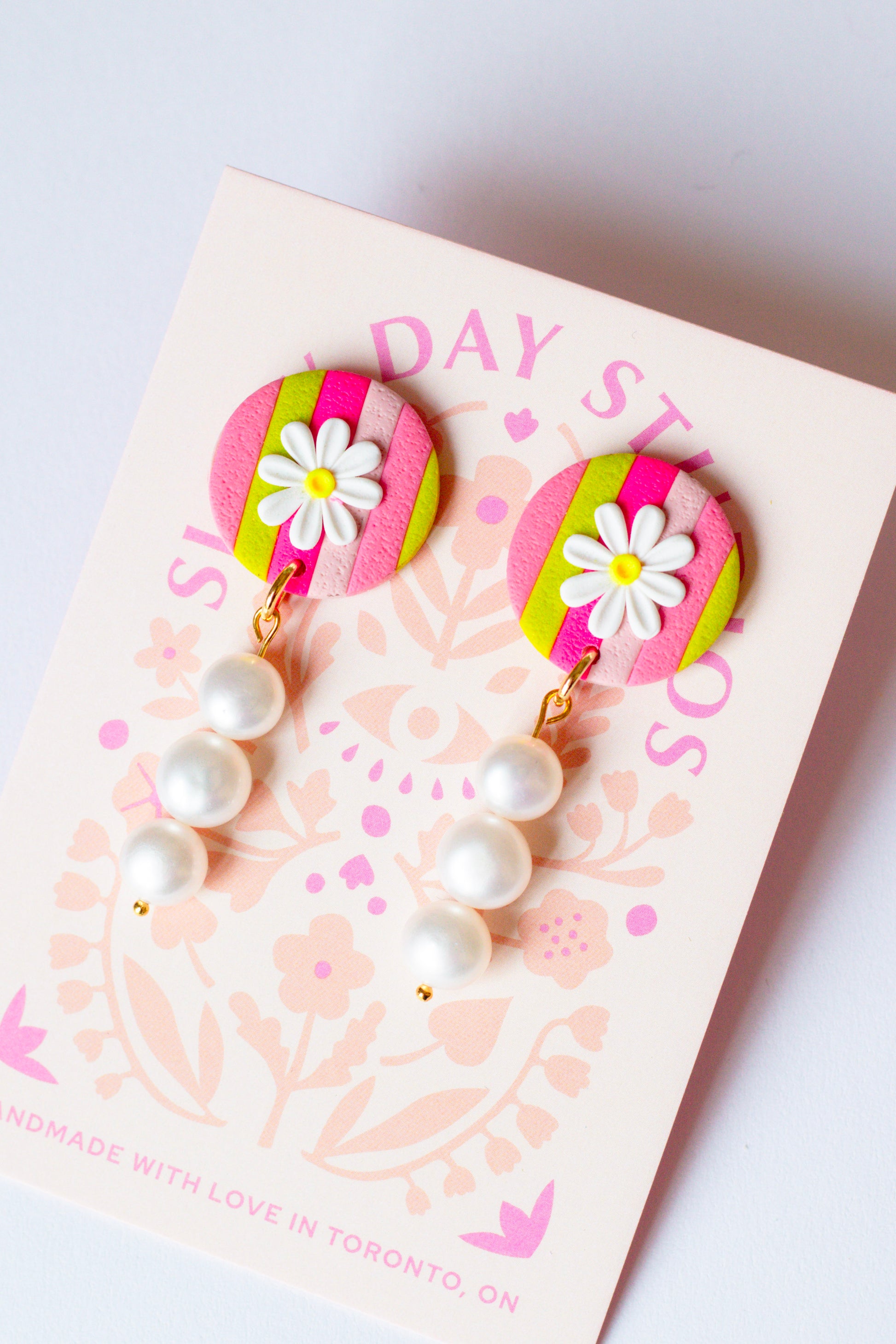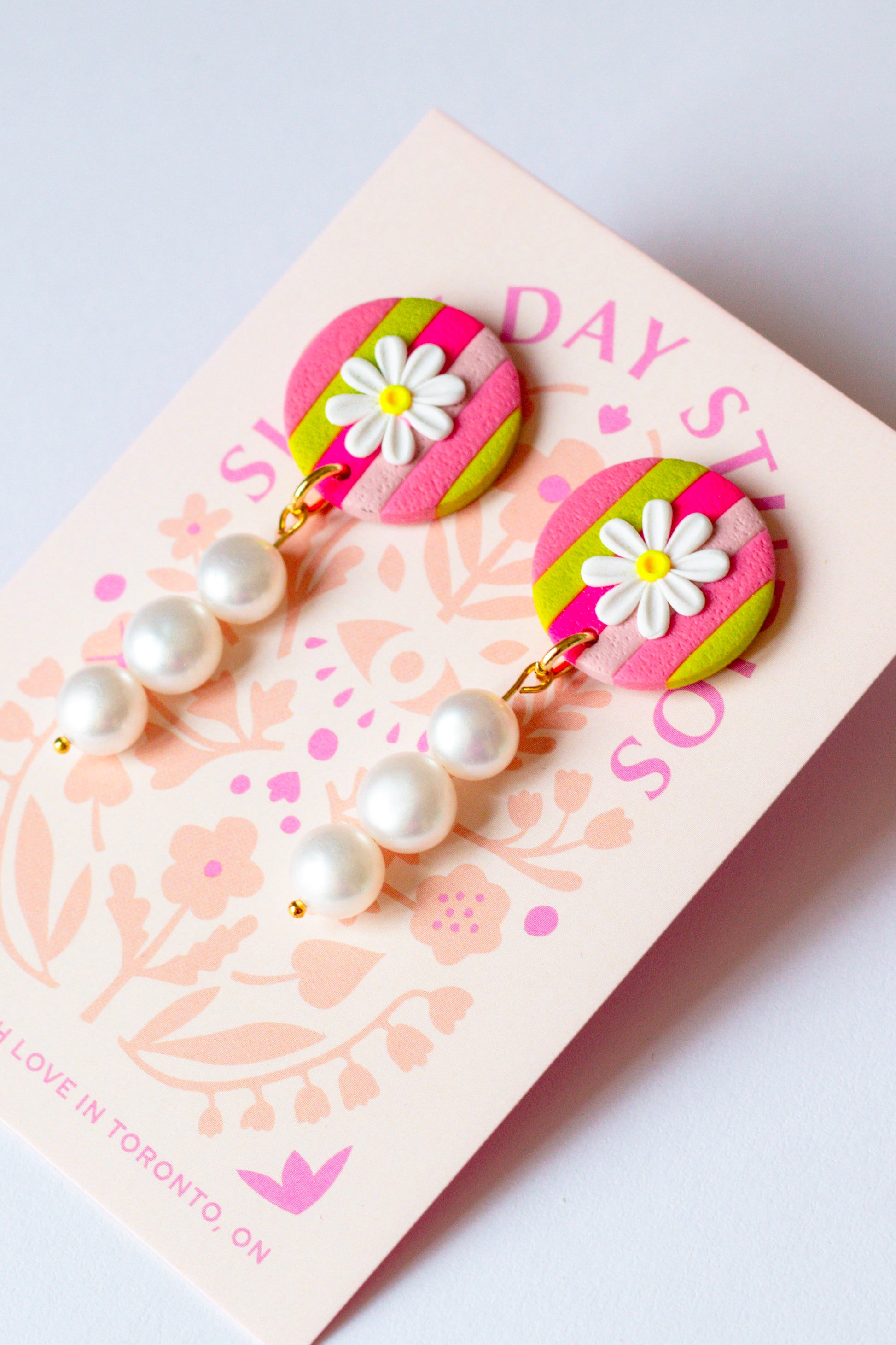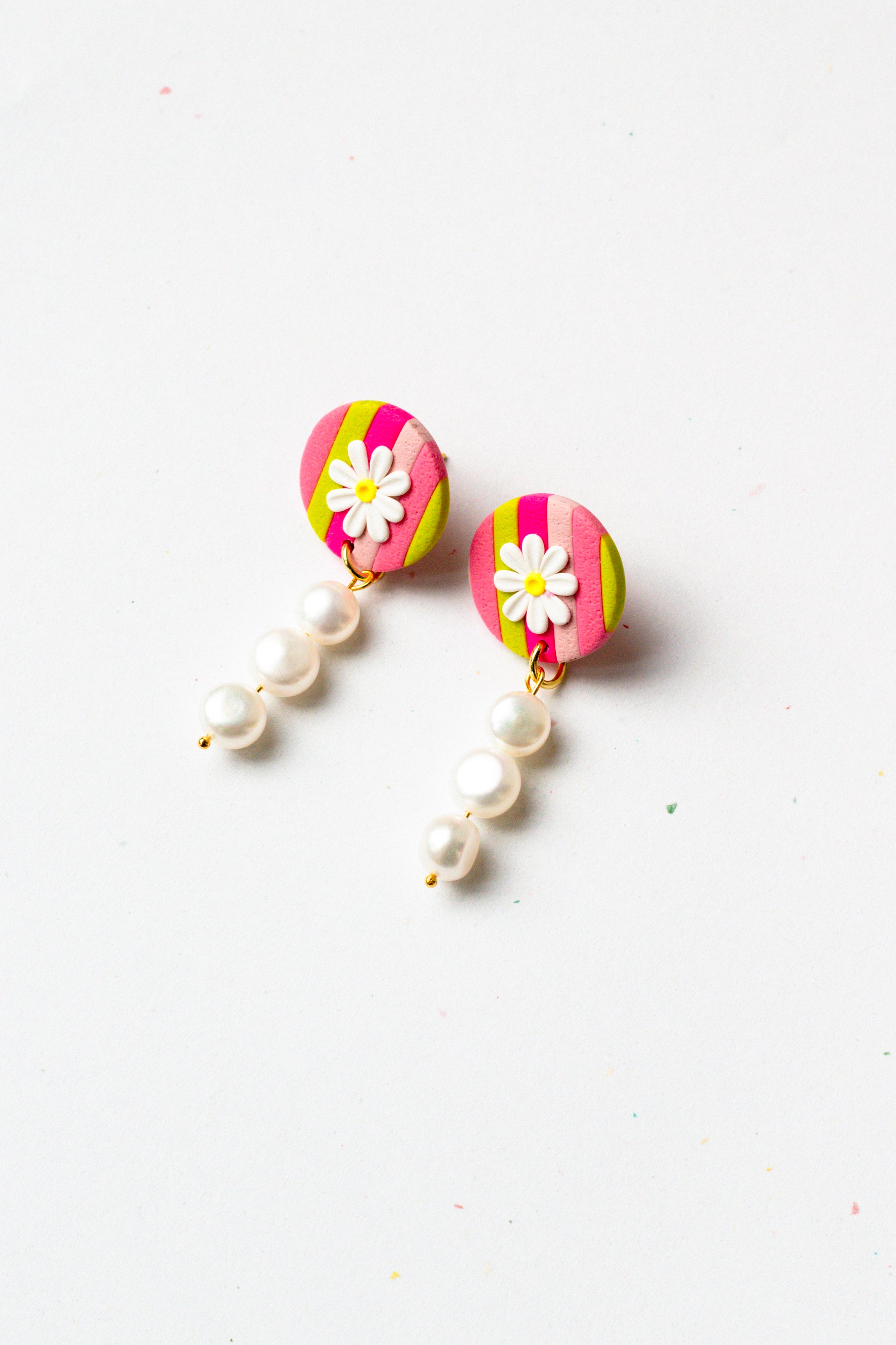 Add a pop of color with these daisy, striped, polymer clay dangle earrings! Adorned with a string of freshwater pearls, they are lightweight, comfortable, and impactful for everyday wear.