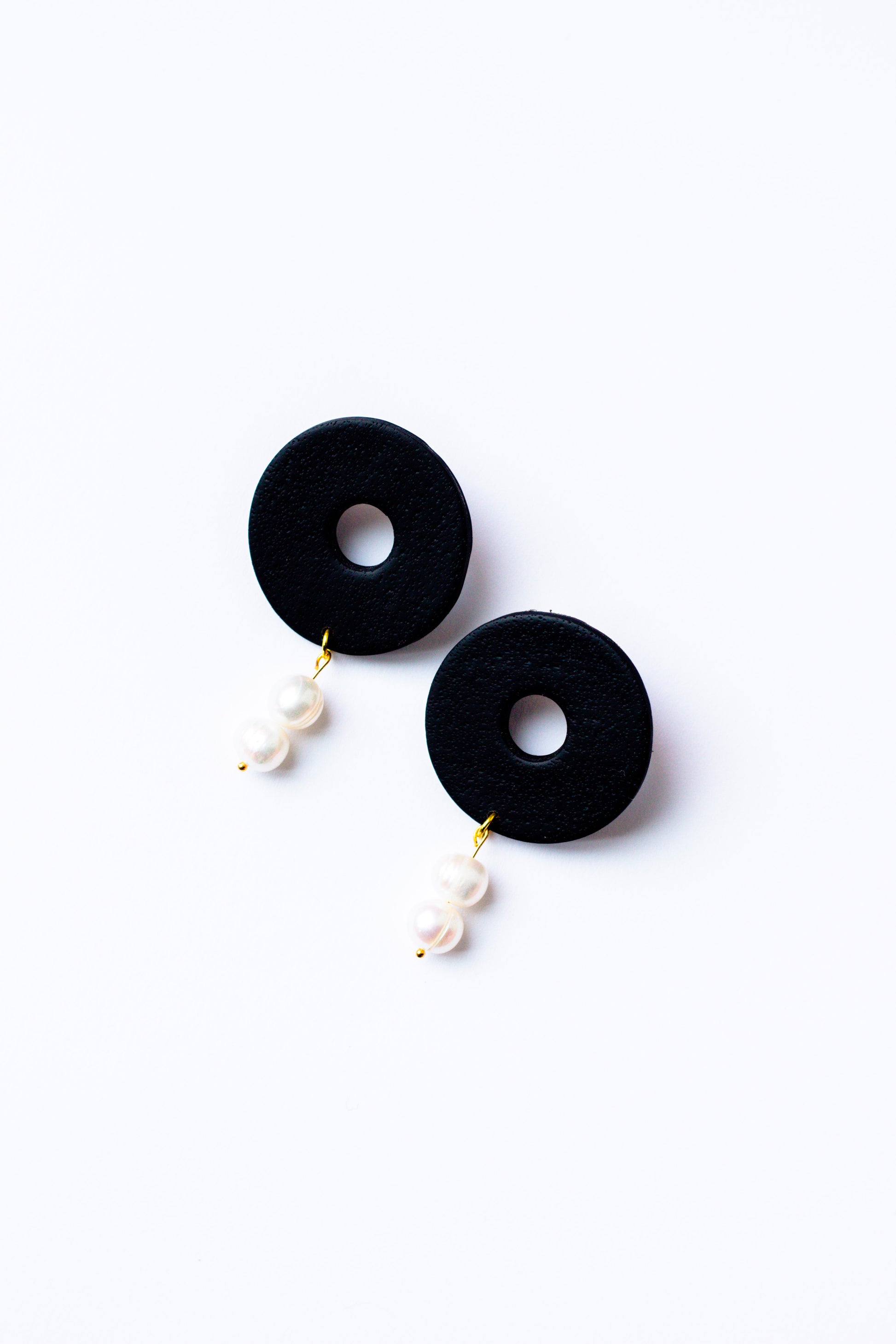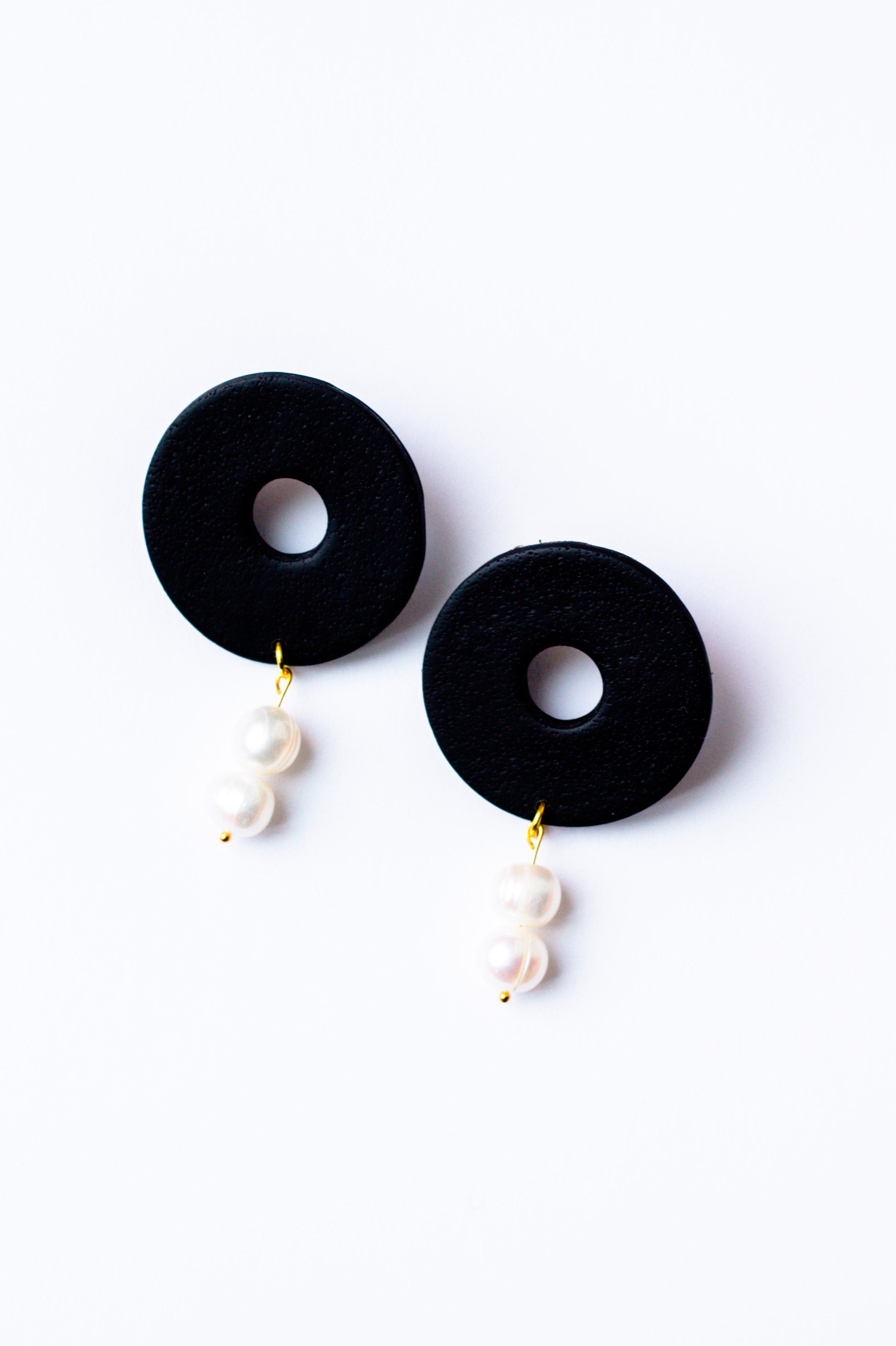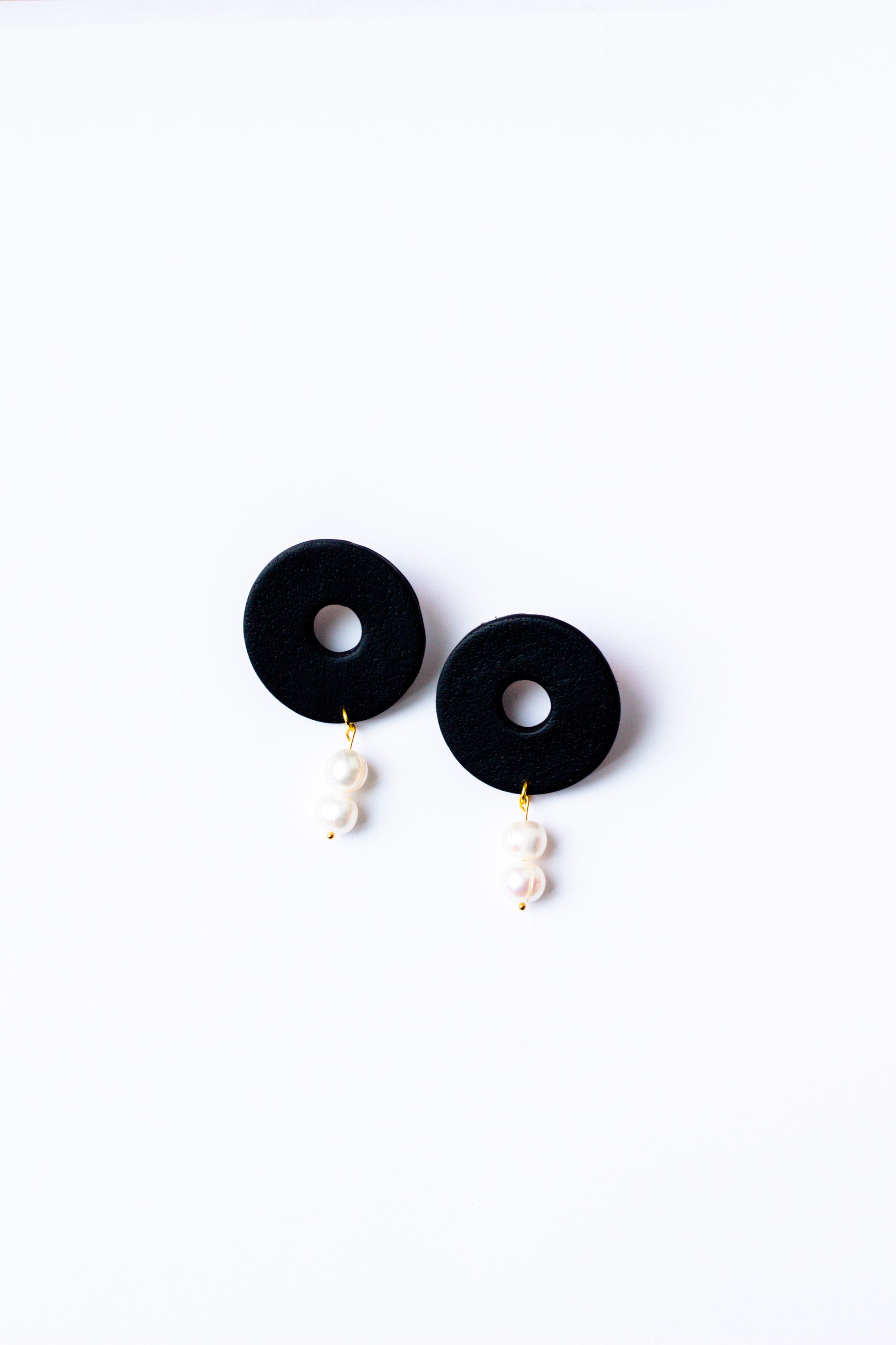 Black polymer clay earrings with a modern twist! Accented with genuine freshwater pearls. Lightweight and minimal, suitable for everyday wear or simple statement looks.