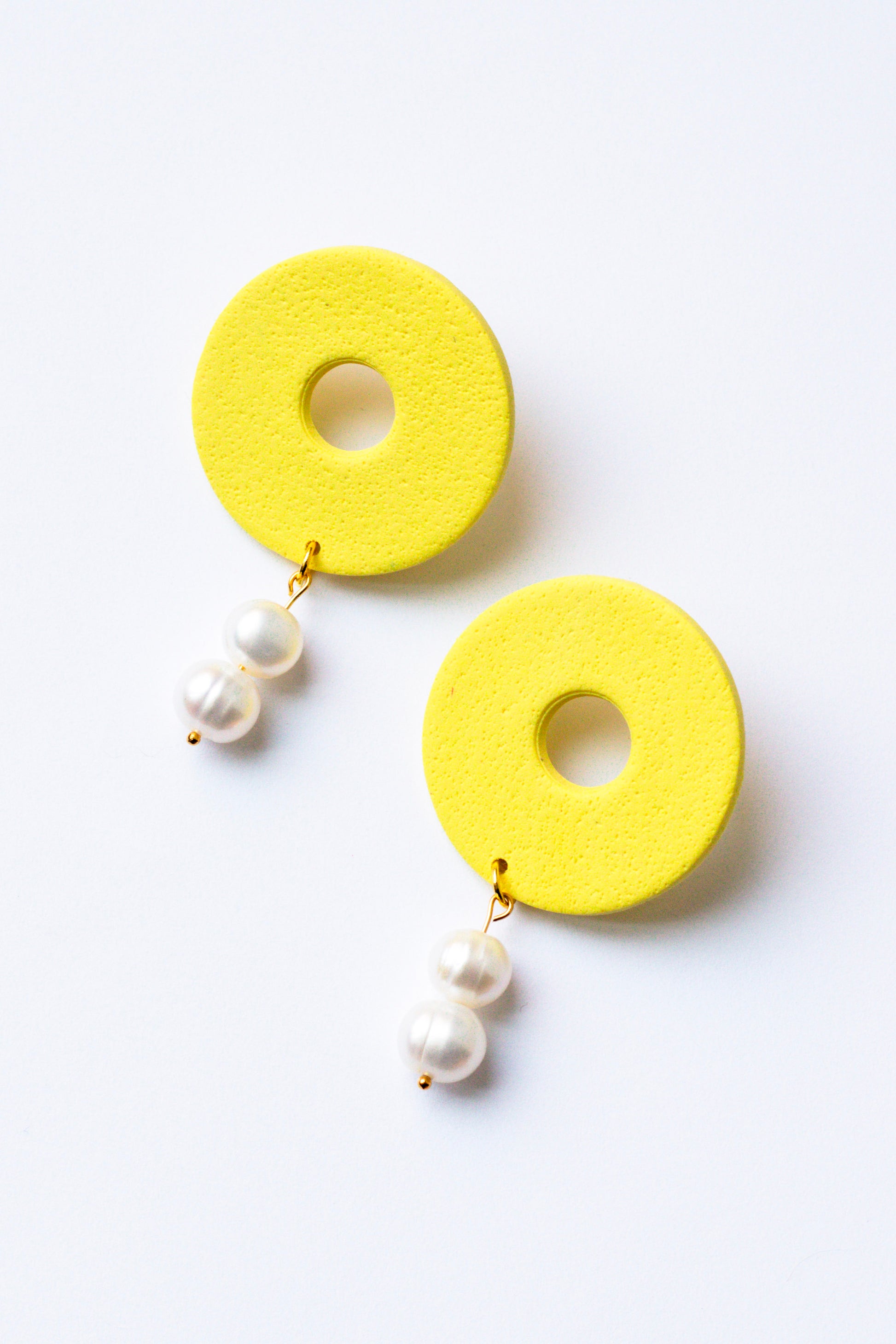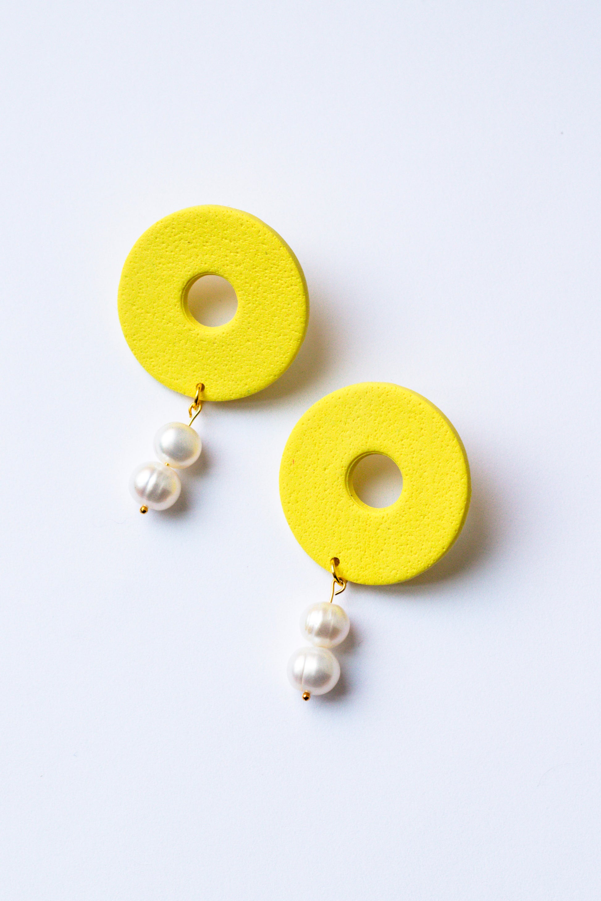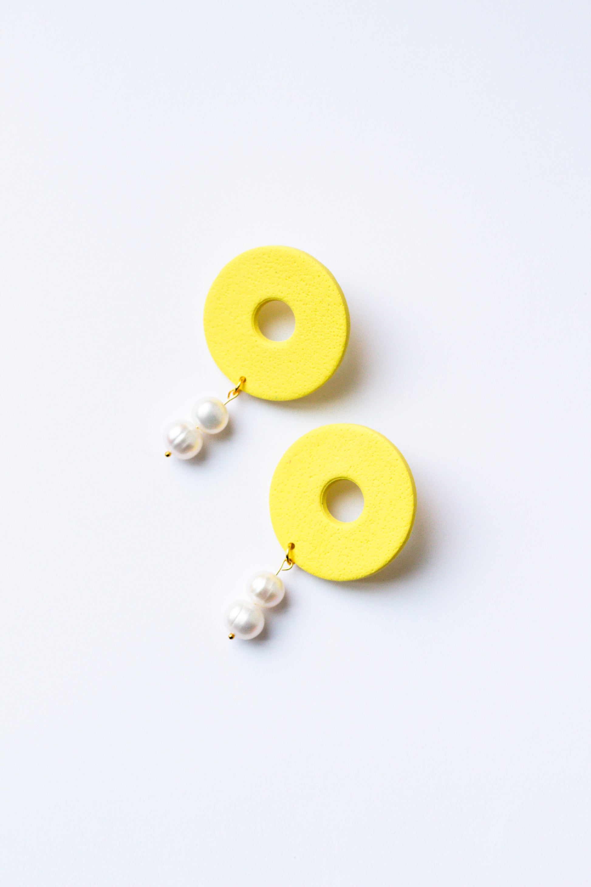 Polymer Clay Donut Statement Stud with Pearl Accents // Butter Yellow