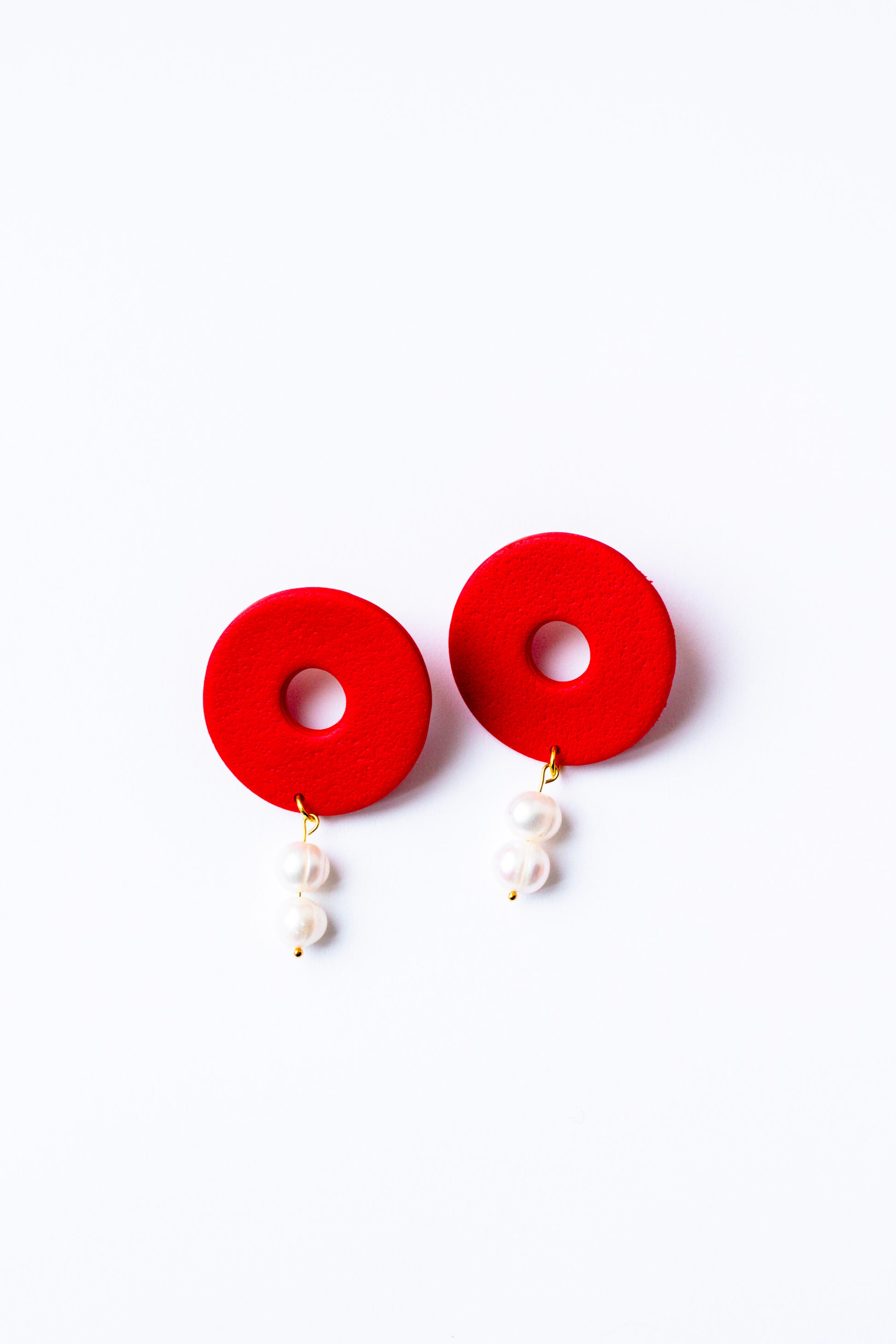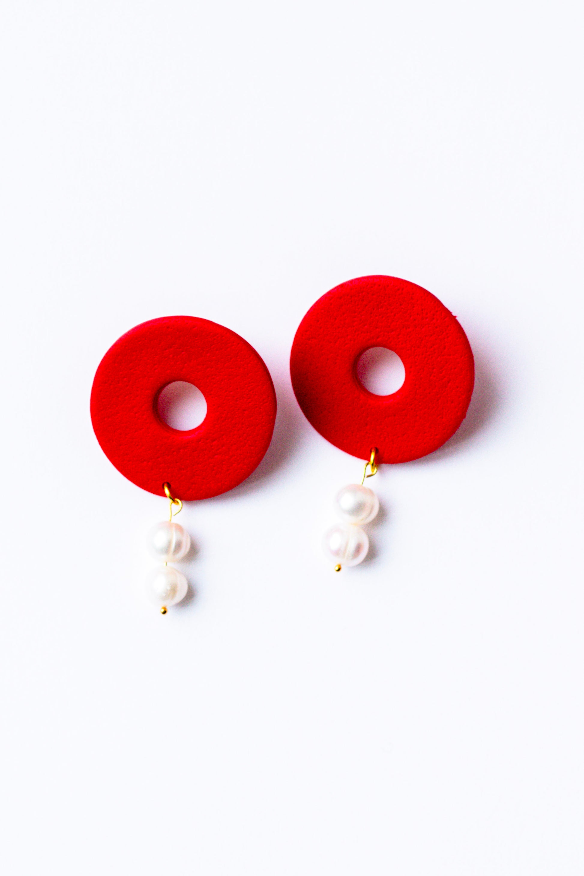 Red polymer clay earrings with a modern twist! Accented with genuine freshwater pearls. Lightweight and minimal, suitable for everyday wear or simple statement looks.