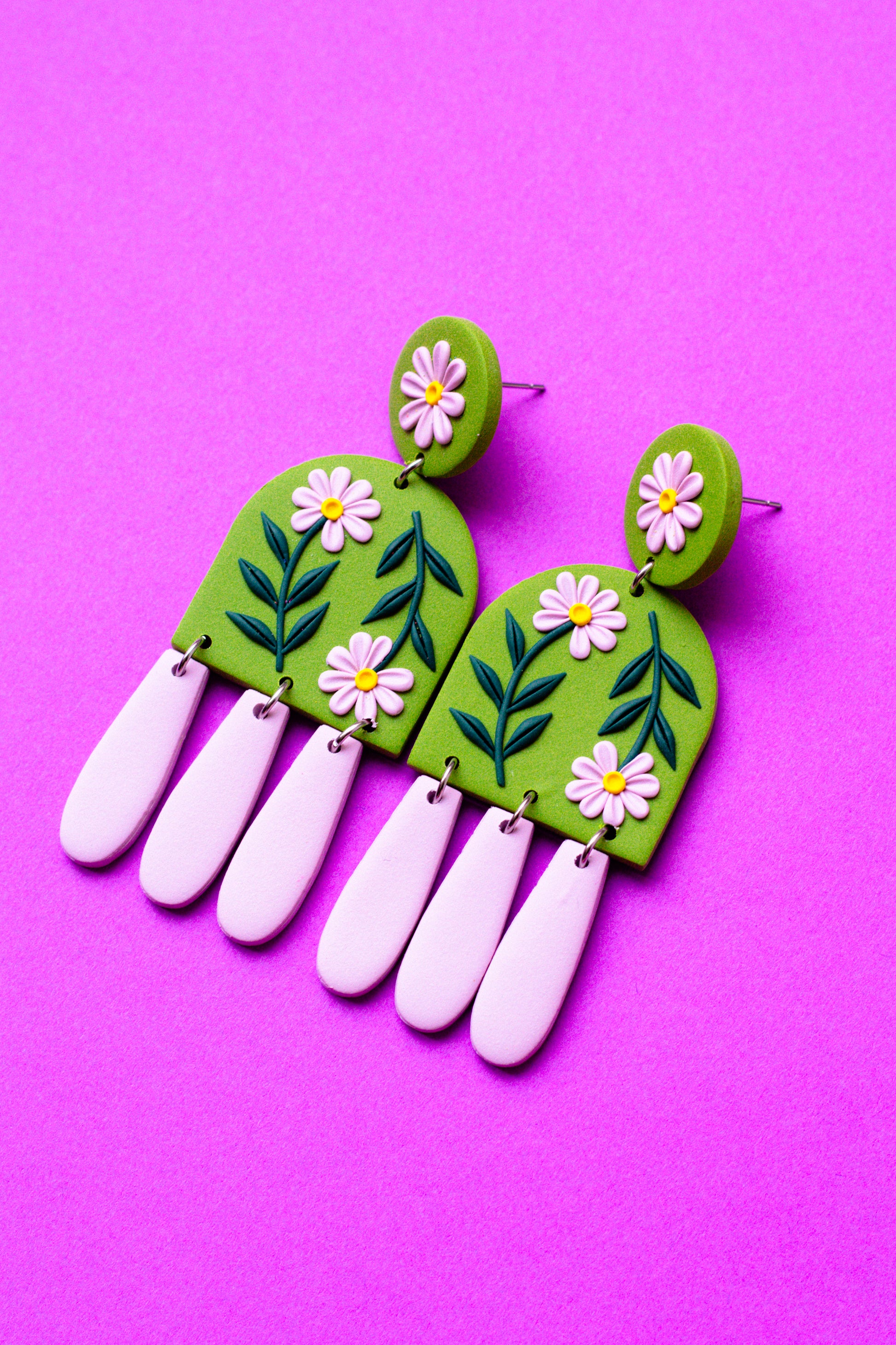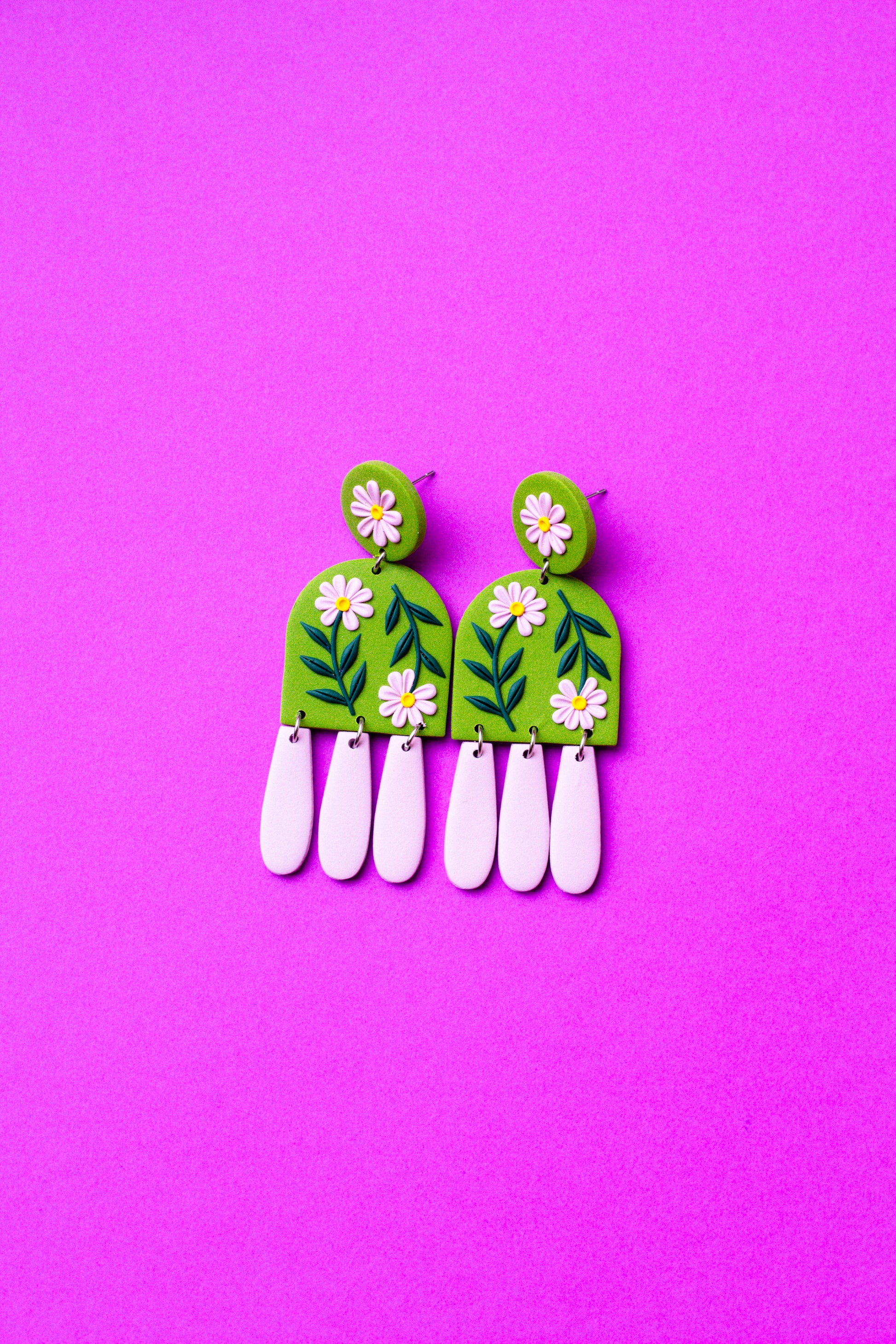 Floral Polymer Clay Dangle Statement Earrings // Olive Green & Lilac