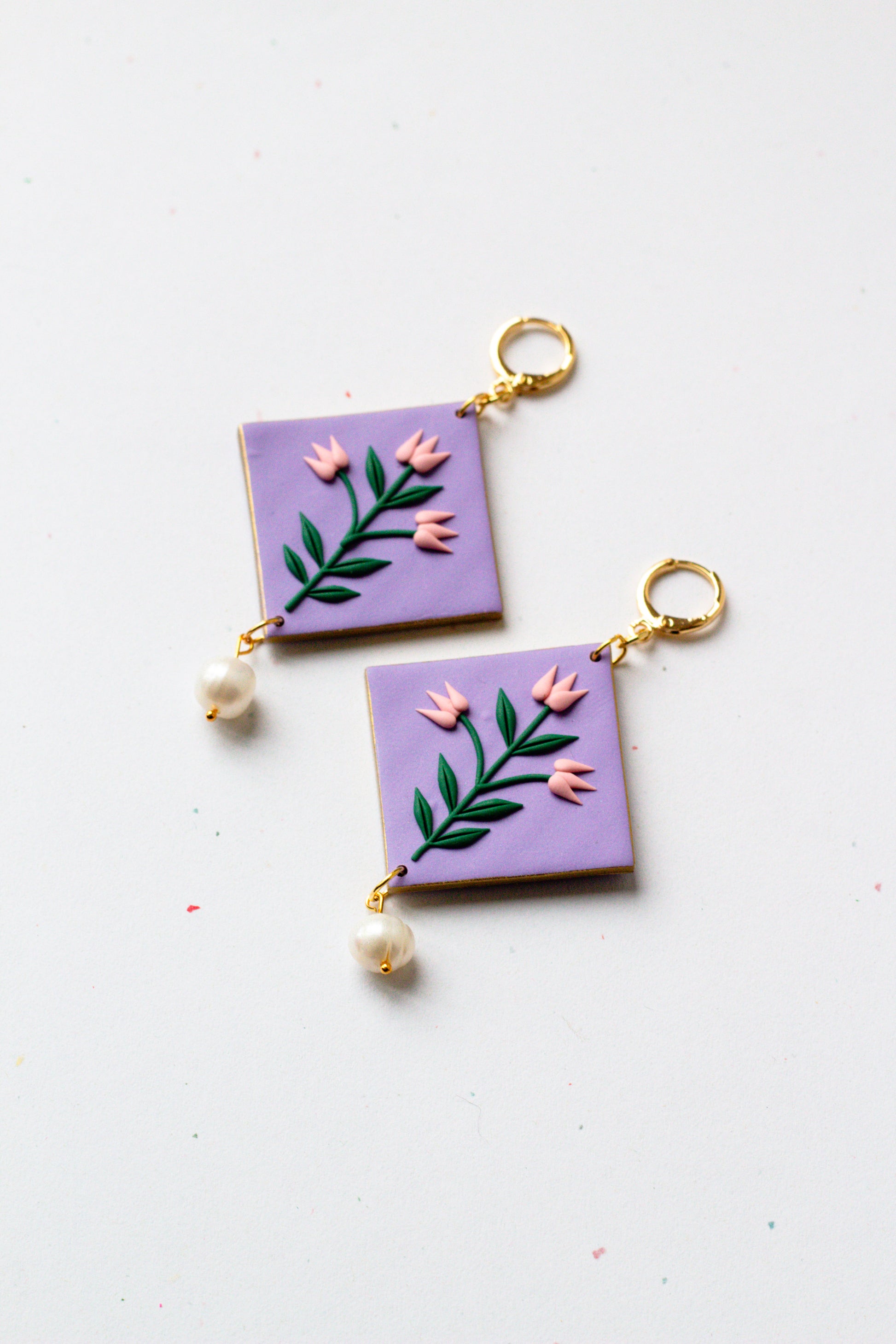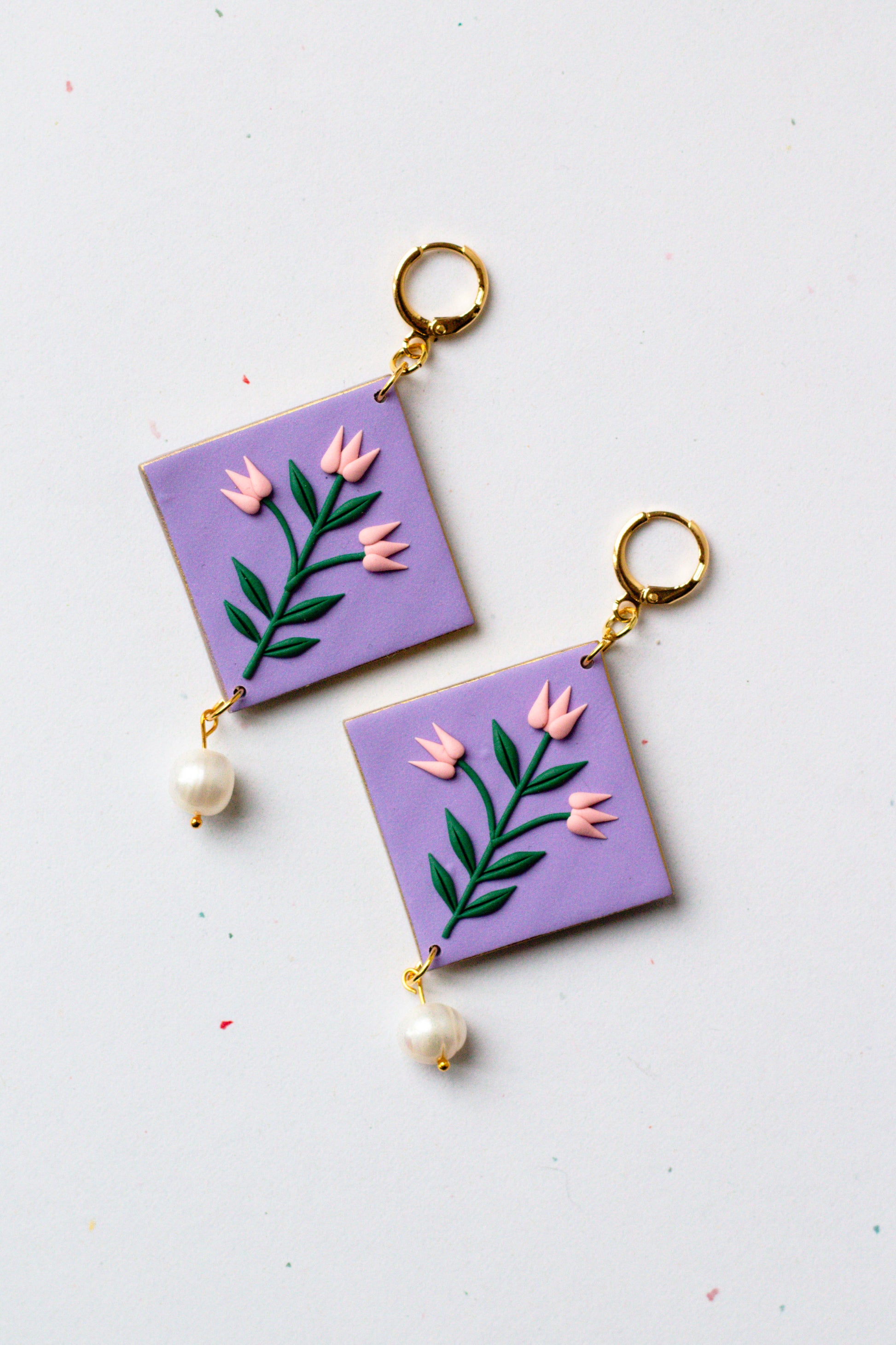 Statement Polymer Clay Tulip Huggie Earrings - Purple