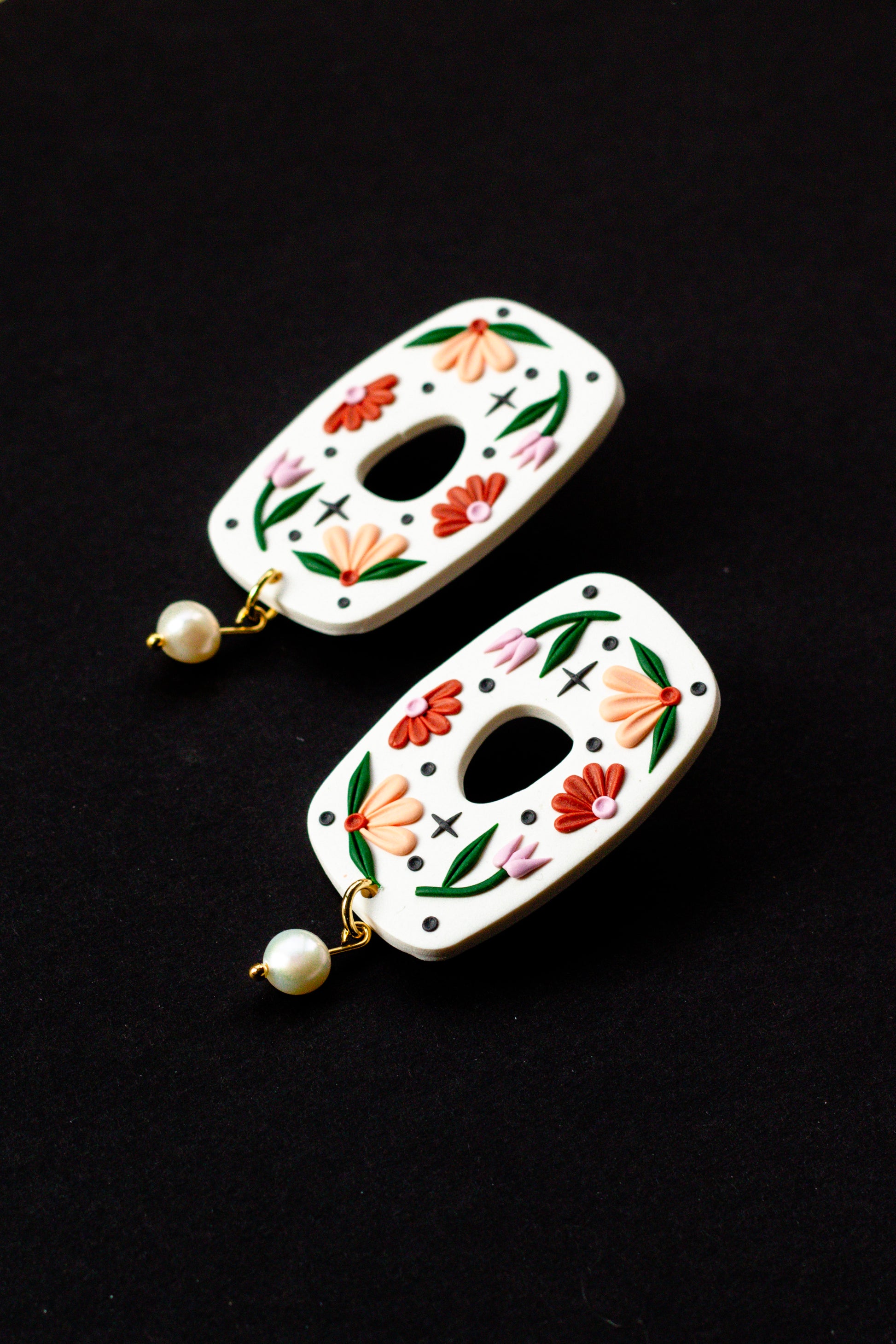 Autumn Floral Polymer Clay Statement Stud (with Freshwater Pearl)