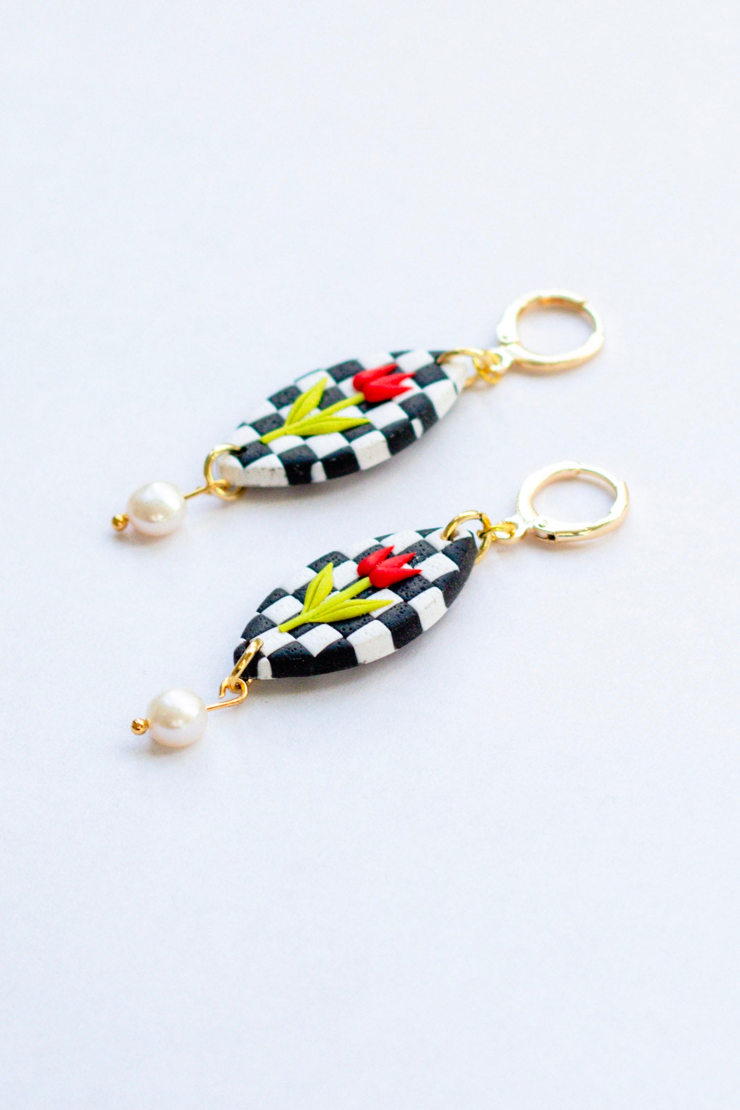 Checkerboard Tulip Huggie with Freshwater Pearl