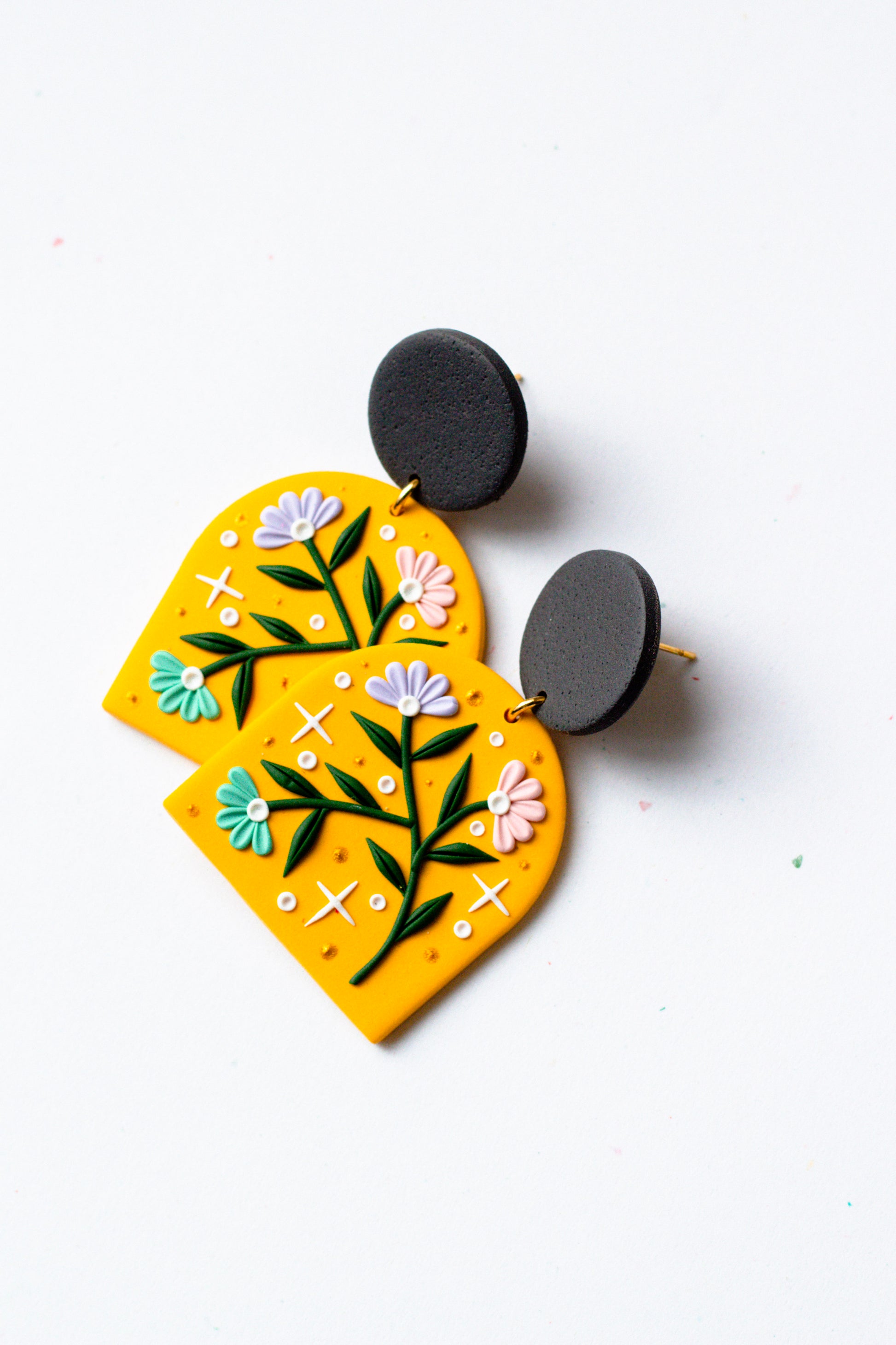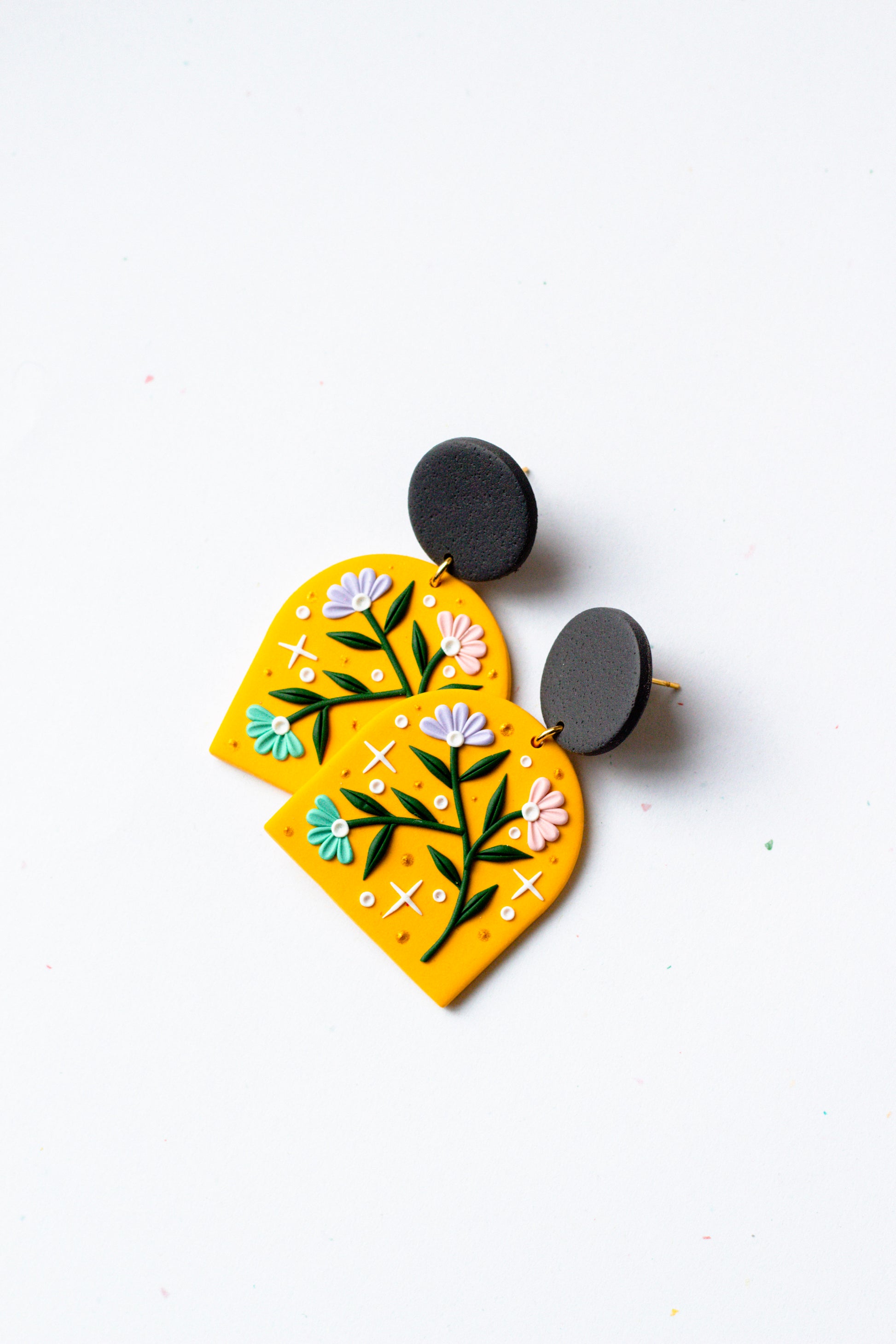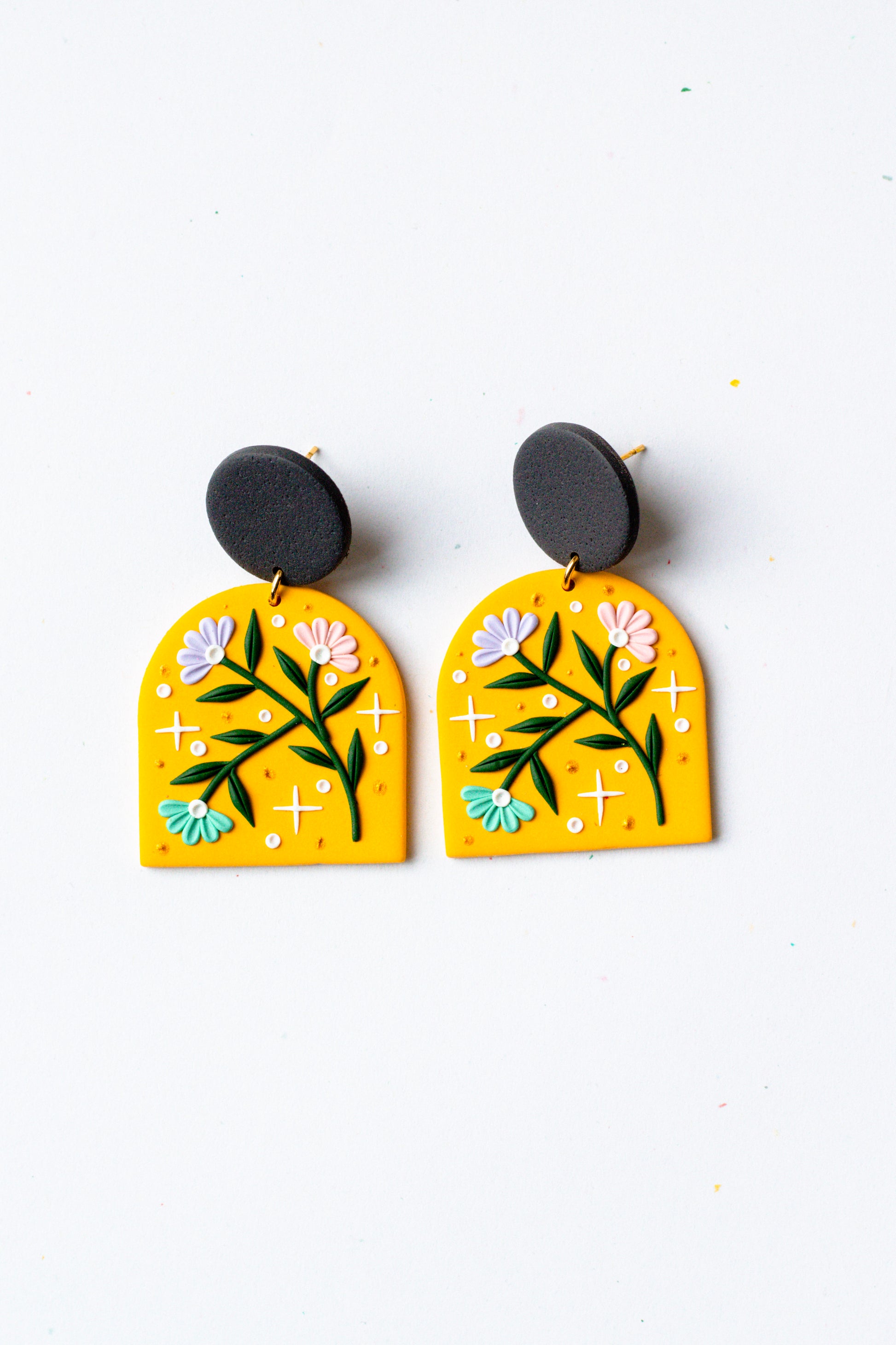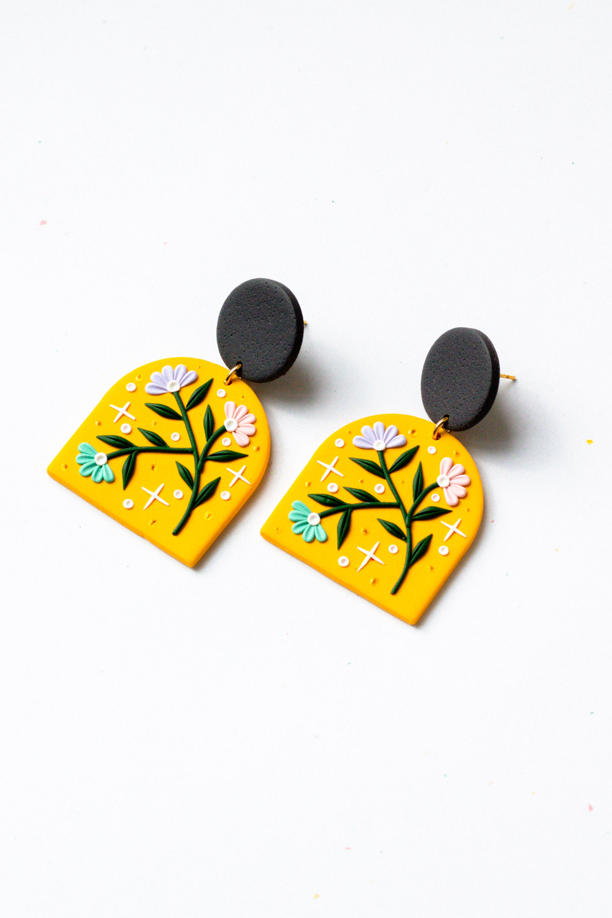Whimsical Floral Arch Earrings - Mustard Yellow